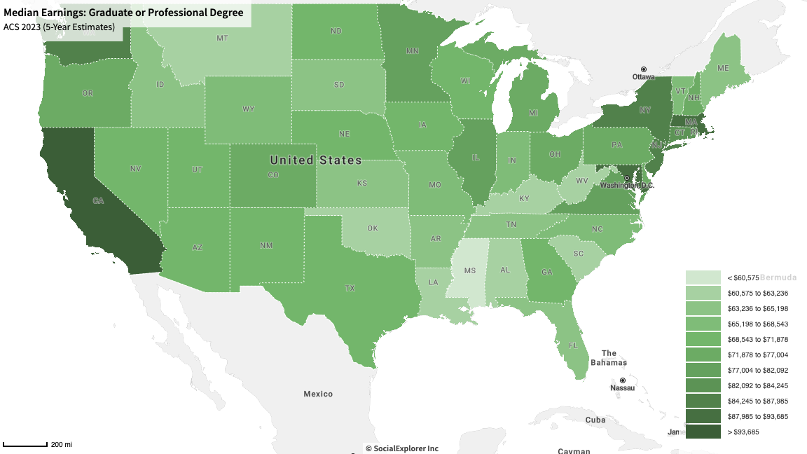 This map is a nationwide representation, state by state, of a data set pertaining to the American Community Survey conducted by the United States Census Bureau. It was created through Social Explorer and tracks the median earnings for individuals with a graduate or professional degree, with darker shading across different states representing a higher median in earnings. This was chosen as a representation towards the narrative that explains the wealth gap and how those who achieve higher education are affected in terms of upward mobility. Relevant to our data set is the actual income of those with higher education. Seeing first whether the standard earnings of those with a professional degree contains a level of income that can close the wealth gap little by little, and then seeing whether higher education directly correlates with reaching a relatively high income, is essentially part of the answer to our group’s research question.
